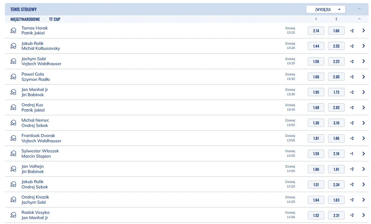 Oferta zakładów na tenis stołowy jest bardzo rozbudowana, ponieważ mecze w tej dyscyplinie rozgrywane są niemal codziennie, a w wielu turniejach zawodnicy grają kilka spotkań jednego dnia. Dotyczy to szczególnie rozgrywek takich jak TT Cup, Setka Cup, Czech Liga Pro czy Liga Pro Ukraina, które są organizowane w systemie turniejowym i przygotowane pod transmisje oraz zakłady bukmacherskie LIVE. W praktyce oznacza to, że w ofercie legalnych bukmacherów można znaleźć od kilkunastu do nawet kilkudziesięciu meczów ping-ponga w ciągu dnia, a kursy pojawiają się od rana do późnych godzin wieczornych.