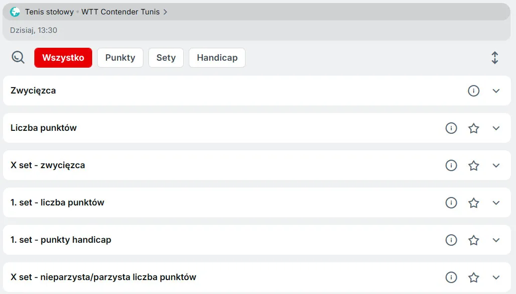 Przy wielu meczach dostępne są także zakłady na zwycięzcę seta, zwycięzcę kolejnego punktu, wyścig do 2, 3, 4 lub 5 punktów oraz zakłady na liczbę punktów jednego zawodnika. W praktyce oznacza to, że gracz może obstawiać zarówno cały mecz, jak i pojedyncze fragmenty gry, co sprawia, że tenis stołowy jest jedną z dyscyplin z najbardziej rozbudowanym rynkiem zakładów LIVE.