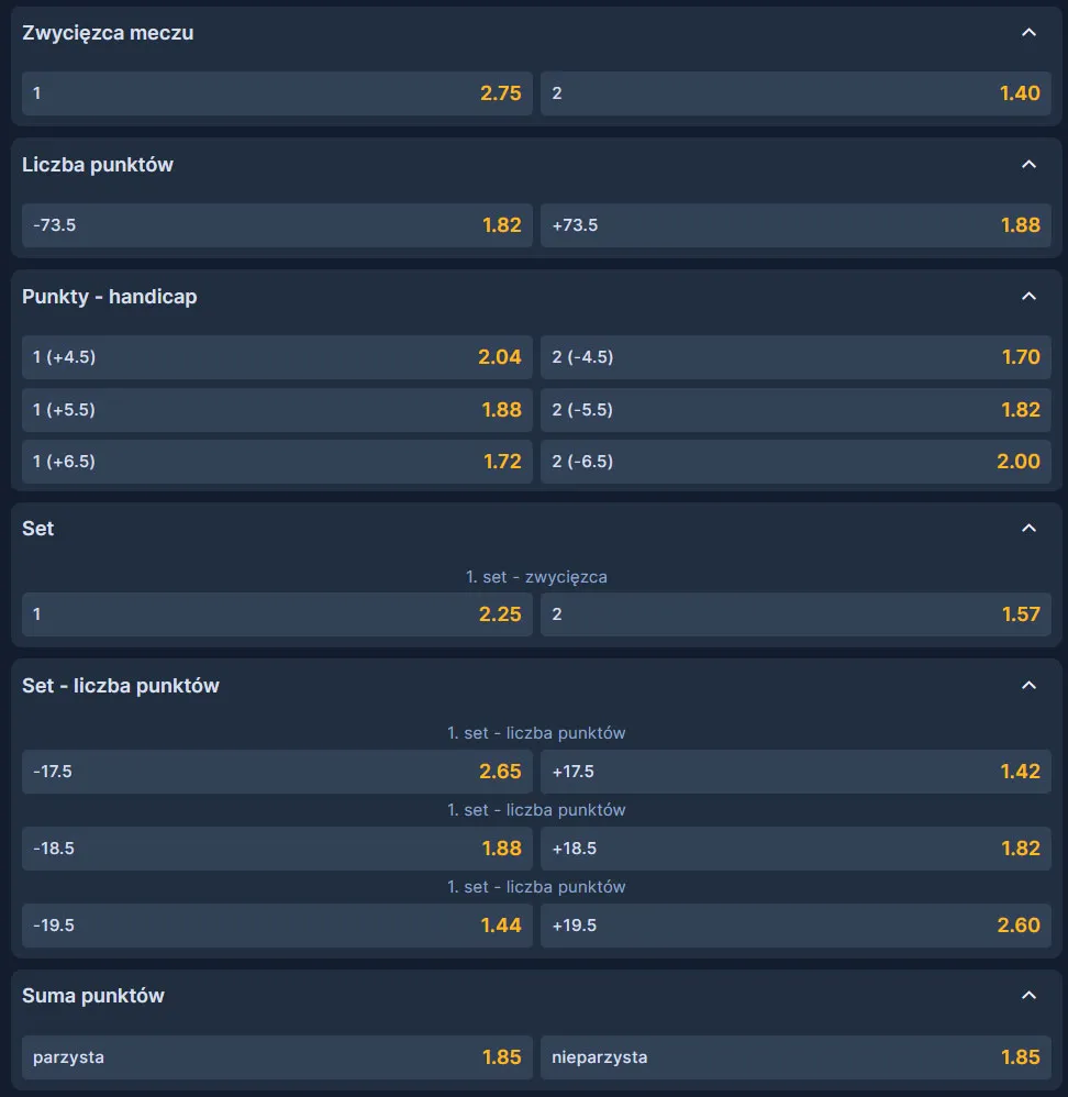 Najprostszy jest zakład na zwycięzcę meczu lub handicap setowy.