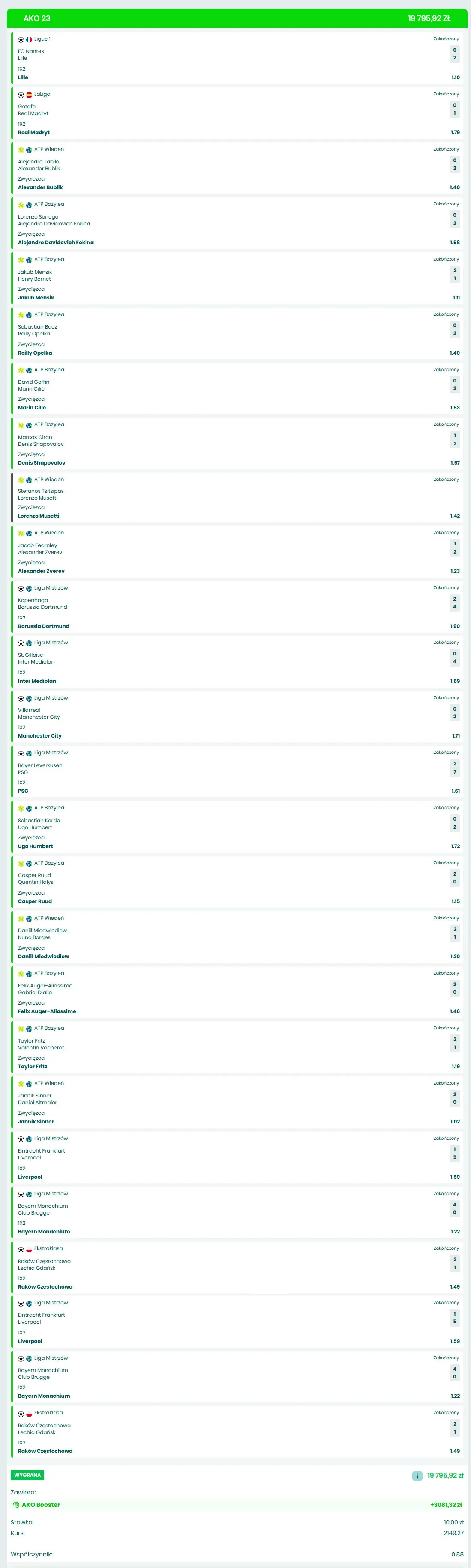 Kupon AKO na puszczony przez klienta Betfan (bukmacher wiarygodny - zobacz kod Betfana do premii 400 zł na takie kupony) zawierał 23 typy mieszane: mecze piłkarskie (m.in. Liga Mistrzów, Ligue 1, LaLiga, Ekstraklasa) oraz pojedynki ATP w tenisie. Kursy jednostkowe na tym kuponie były w przedziale ~1.10–1.90. Całkowity kurs wyniósł 2149,27, stawka to 10 zł, a wygrana brutto 19 795,92 zł (widoczne na kuponie). AKO Booster zwiększył wygraną o 3 081,32 zł, co stanowi istotną premię do końcowego zysku.