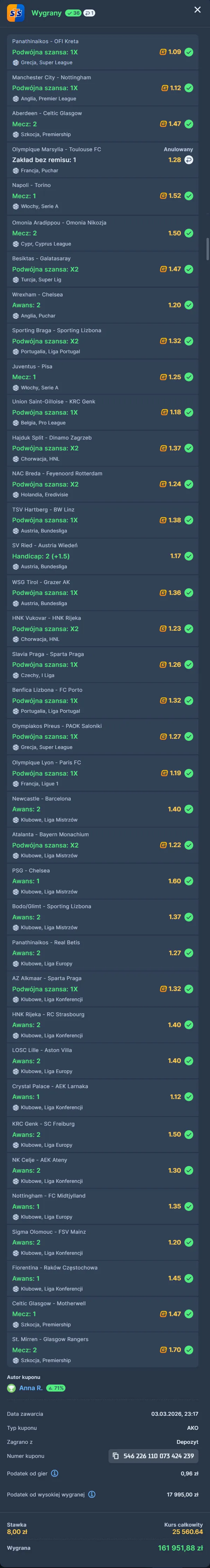 Tak było również w tym przypadku. Gracz o imieniu Anna, która założyła konto w STS z użyciem kodu promocyjnego o treści LEGALSPORT, zagrała 3 takie same kupony AKO oparte na bardzo dużej liczbie selekcji i trafiła kurs przekraczający 25 000. Efektem była wygrana ponad 160 000 zł na jednym kuponie i łączny wynik bliski pół miliona złotych wypłaconych przez bukmachera.