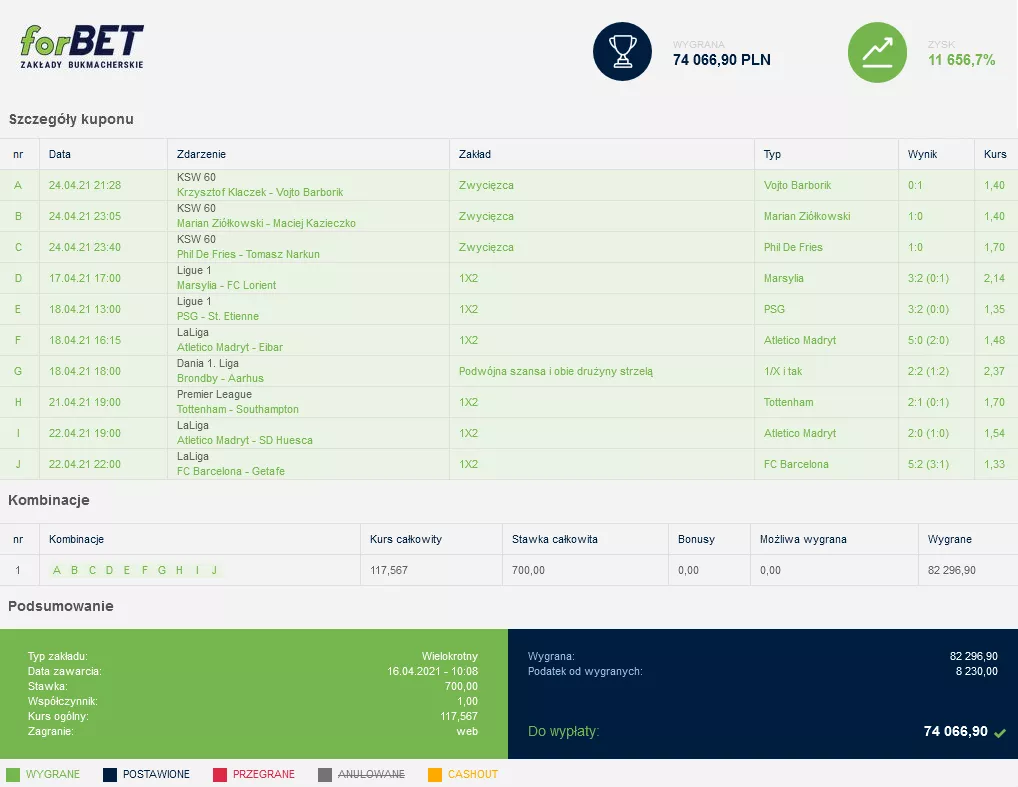 Finalnie kurs całkowity z tego kuponu wielokrotnego zrobił na nas olbrzymie wrażenie i wyniósł aż 117.56. Gracz na swój zakład przeznaczył kwotę 700 zł (możliwe że w ramach premii powitalnej jako bonus startowy) i zgarnął od bukmachera 82 296 zł. Jako, że wygrana znacznie przekroczyła kwotę 2280 zł, od kuponu musiał zostać odprowadzony dodatkowy 10% podatek od wygranej, czyli 8 230 zł. Z tego powodu ostateczna wypłata na konto typera opiewała na kwotę 74 066 zł!