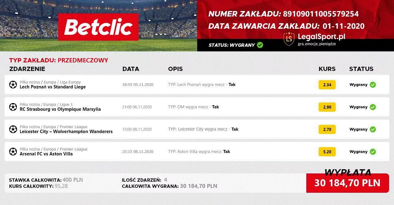 Typujący zawarł kupon AKO składający się z 4 typów. Obstawiający postawił na zwycięstwa Lecha Poznań ze Standardem Liege, Aston Villi z Arsenalem oraz Olympique Marsylia ze Strasburgiem i Leicester City z Wolverhampton Wanderers. Kurs ogólny tego zakładu bukmacherskiego to 95,28.