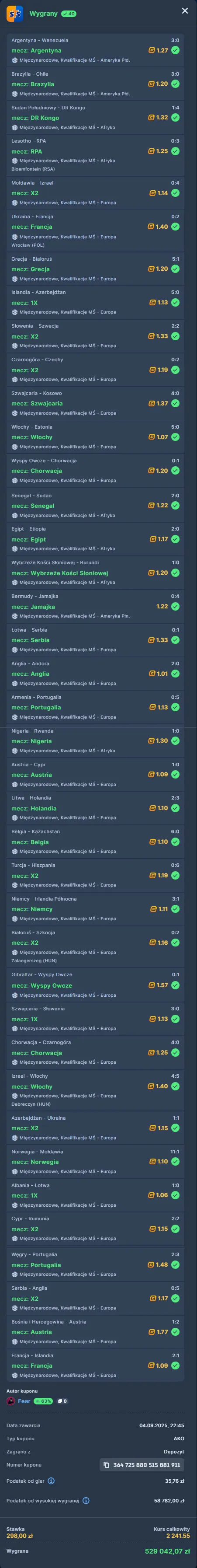 Stawka kuponu wyniosła 298,00 zł. Przy kursie całkowitym 2241.55 wygrana brutto 587 824,07 zł. Na kuponie nie pojawiły się rynki specjalne ani zakłady wysokiego ryzyka. To jasno pokazuje, że wygrana nie była efektem jednego zdarzenia losowego, lecz konsekwentnej selekcji spotkań.