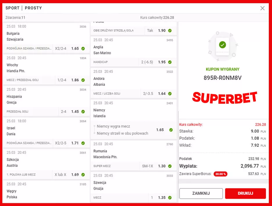 Jednak ponieważ od sumy powyżej 2280 zł każdy legalny operator zakładów wzajemnych ma obowiązek pobrania kolejnego 10% podatku od wygranej, w tym konkretnym przypadku dało niespełna 233 zł. Ostatecznie gracz na swoim koncie w Superbet mógł zainkasować 2 096,77 zł, co i tak jest ogromnym zyskiem, biorąc pod uwagę stawkę jego kuponu.