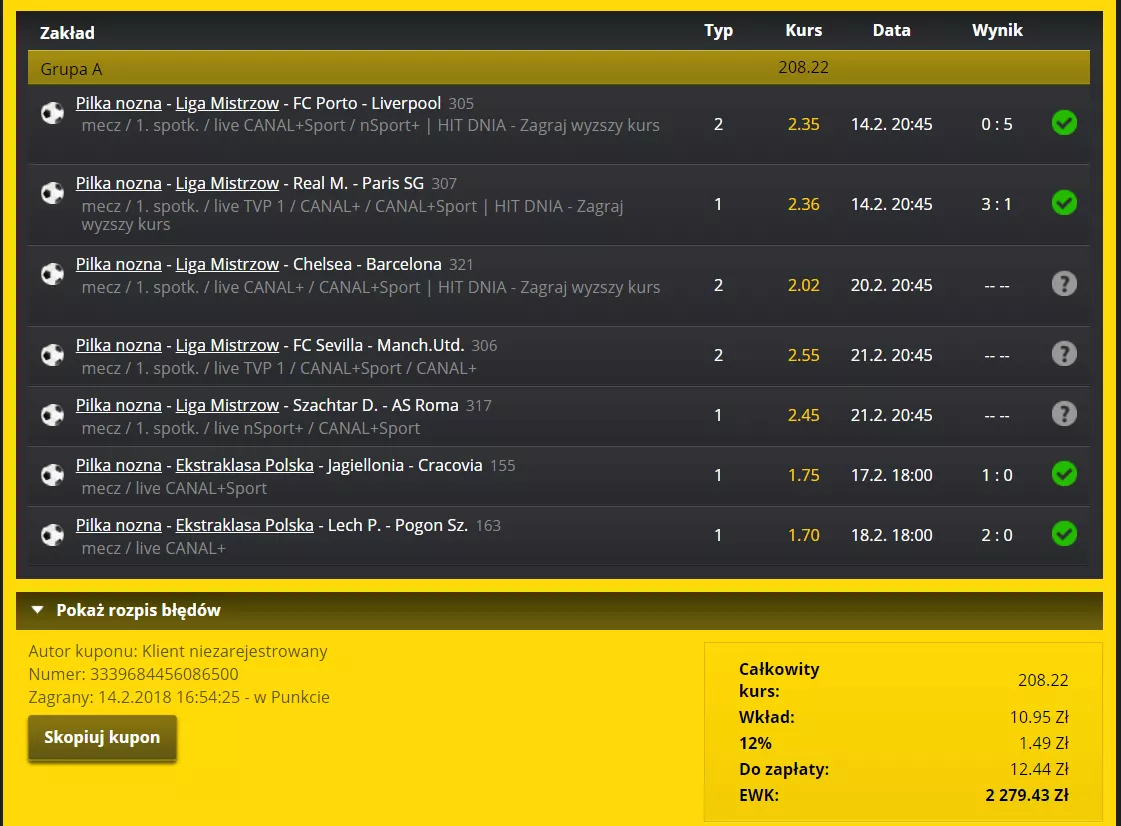 Poszczególne kursy na tym kuponie bukmacherskim wahają się pomiędzy 1,70 a 2,55. Najniższy kurs „należy” do niedzielnego spotkania Lech Poznań – Pogoń Szczecin (2:0) – postawił na Kolejorza i trafił, natomiast najwyższy do dzisiejszej rywalizacji Sevilli z Manchesterem United – wytypował triumf Czerwonych Diabłów. Jak do tej pory klientowi Fortuny nie wszedł tylko jeden mecz. We wczorajszym starciu londyńskiej Chelsea z FC Barceloną wytypował „dwójkę”, natomiast rywalizacja na Stamford Bridge zakończyła się remisem 1:1.