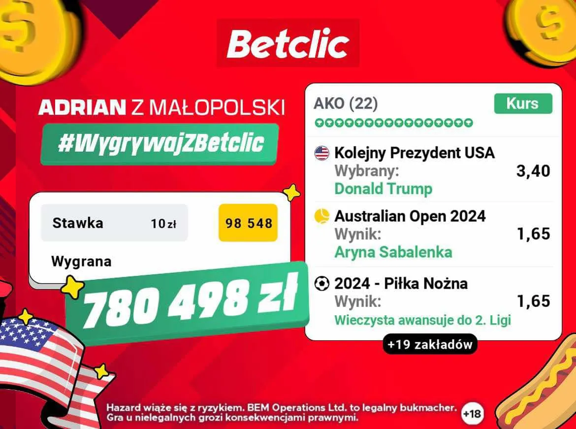 Najwyższa wygrana w Betclic wynikała z bardzo wysokiego kursu akumulowanego. Kupon Adriana z Małopolski miał łączny kurs 98 548.00 na który złożyły się 22 zdarzenia. W efekcie wygrana brutto wyniosła 867 222,40 zł i jest najwyższą oficjalnie potwierdzoną kwotą przez tego bukmachera.