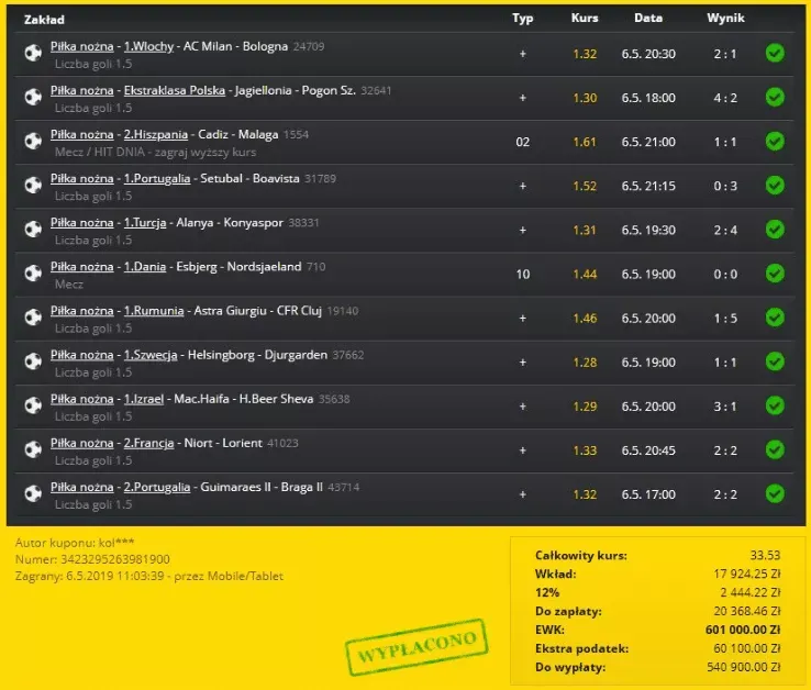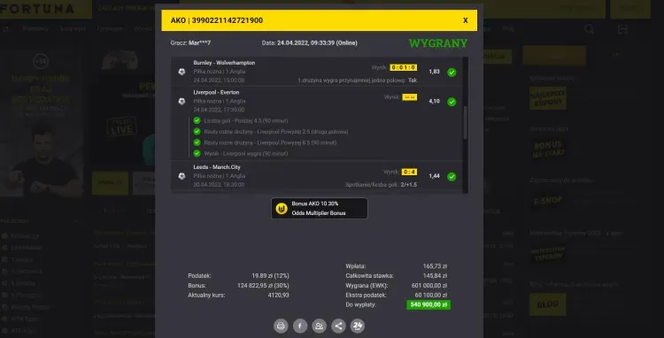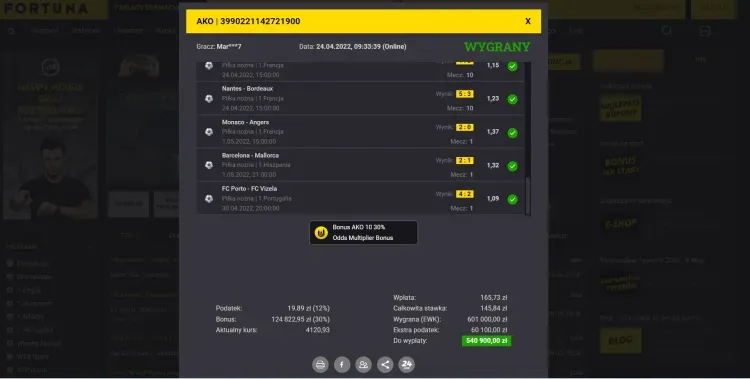 Ta pozycja jest idealnym potwierdzeniem, że wygrywać wysokie sumy można również na mniej medialnych pojedynkach. Jeżeli chodzi o dane techniczne tego kuponu bukmacherskiego, to tak. Kurs całkowity na zakładzie wynosił 33,53. Kupon został postawiony za 20 368,46 zł. Typerowi Fortuna, który ten kupon postawił w aplikacji mobilnej, wypłaciła 540 900 zł.