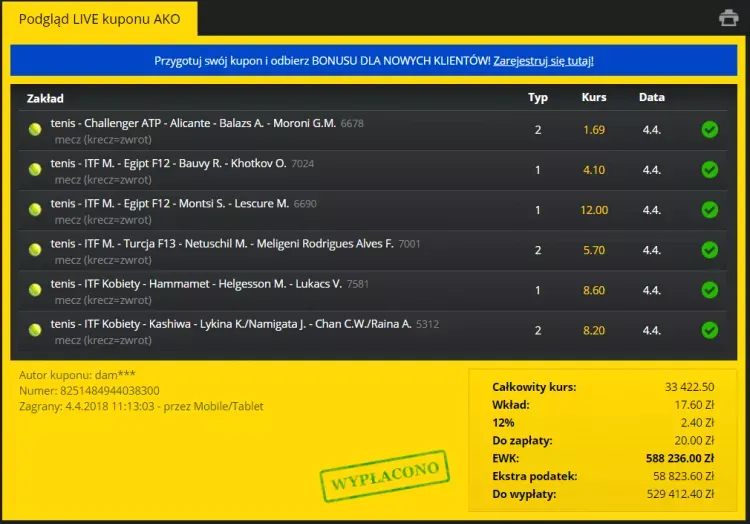Były to między innymi typy na zwycięstwo Siphosothando Montsiego nad Mickiem Lescurem (kurs 12,00) oraz wygraną Molly Helgesson z Vandą Lukacs (kurs 8,60). Całkowity kurs kuponu bukmacherskiego wynosił łącznie aż 33 422,50. Okazało się, że bukmacherski gracz wytypował wszystkie wyniki poprawnie i wzbogacił się o ponad 529 000 zł, co daje mu spore pole do popisu i mega budżet na przyszłość.