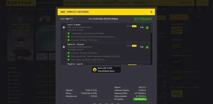 Poniżej bardzo dokładnie prześwietlimy kupon gracza, który wygrał w Fortuna na 1.5 mln zł. Trafiony kurs bukmacherski osiągnął kosmiczną wartość 4120.93. Typer postawił trzy identyczne zakłady online, każdy za stawkę 165,73 zł z możliwą wygraną 540 900 zł, czyli zgarnął łącznie 1 622 700 zł! Warto dodać, że wysokość ostatecznej wygranej zwiększyła się o aż 30% w związku z liczbą zdarzeń objętych promocją AKO Bonus. Co dokładnie znalazło się na wygranym mega kuponie?