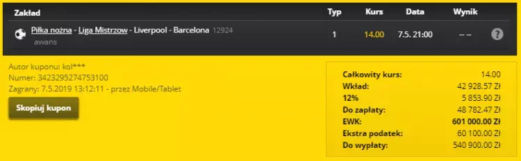 Bukmacher eFortuna Zakłady Bukmacherskie w mgnieniu oka wypłacił typerowi gotówkę na saldo depozytowe (buk rozliczył automatycznie wszystkie trafione zakłady). Szybkie rozliczenie kuponów zachęciło typującego do dalszej gry. W efekcie obstawił on kupon SOLO (pojedynczy), za stawkę niemal 49 000 zł, na awans Liverpoolu w spotkaniu z FC Barceloną po kursie 14.00.