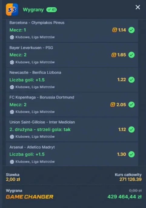 Jedna z najbardziej spektakularnych historii związanych z wysokimi wygranymi w STS dotyczy kuponu, w którym gracz postawił zaledwie 2 zł, a ostateczna wypłata przekroczyła 429 tys. zł. To przykład zakładu akumulowanego o bardzo wysokim kursie całkowitym, który powstał poprzez połączenie kilku zdarzeń z rozgrywek Ligi Mistrzów. Kupon został rozliczony z wykorzystaniem funkcji GChangera, dzięki której nawet przy jednym nietrafionym typie możliwe było zachowanie wysokiej wygranej.