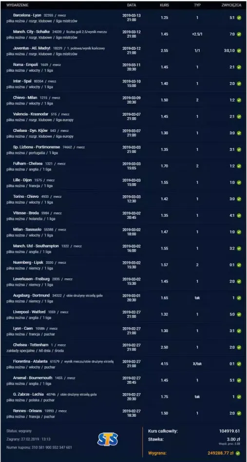 STS wygrana 249 288 zł na kuponie z kursem ponad 100 tys.