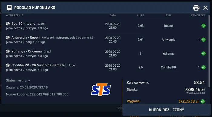 Super wygrana w STS 372 123 zł – kupon AKO z czterema zdarzeniami