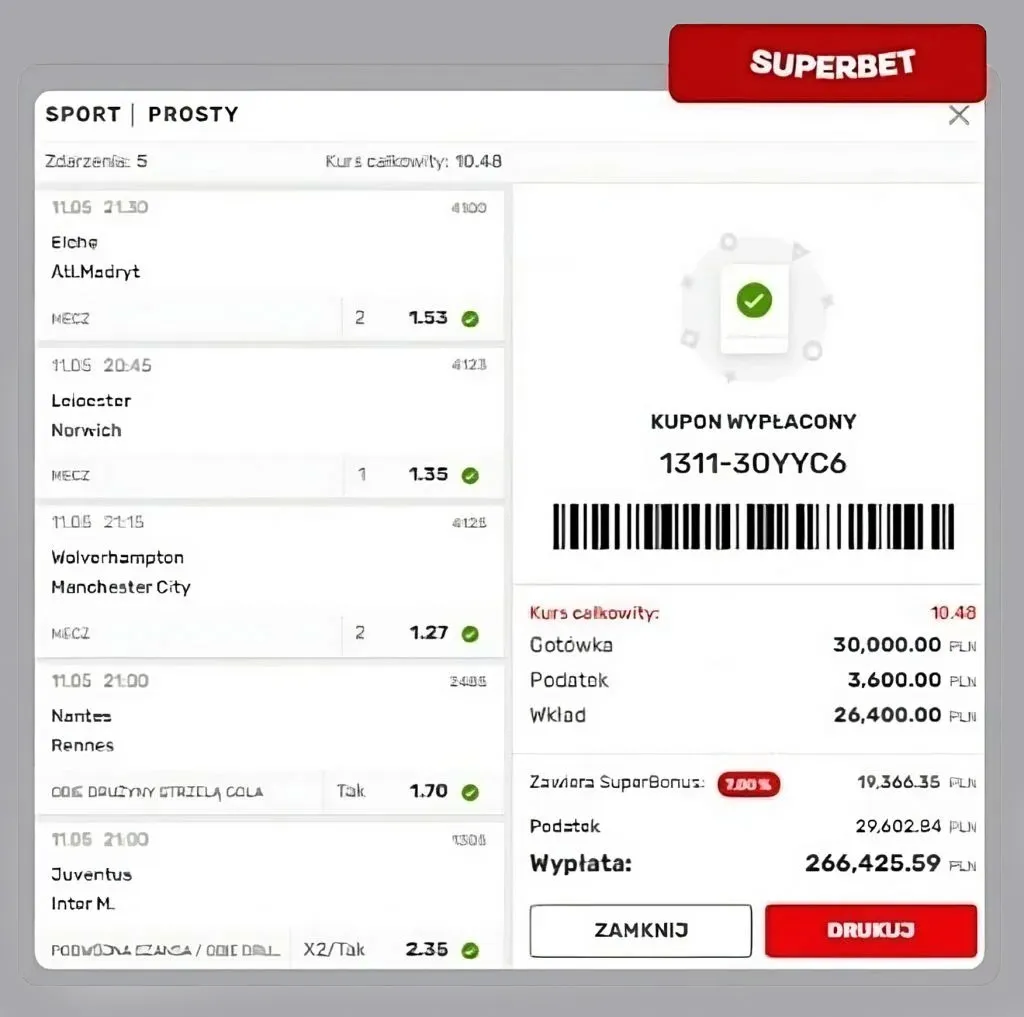 Jedna z najwyższych wygranych w Superbet została osiągnięta w zupełnie inny sposób niż w przypadku długich kuponów z bardzo wysokim kursem. Tym razem gracz postawił na niewielką liczbę zdarzeń, ale zdecydował się na bardzo wysoką stawkę. Kupon składał się z pięciu spotkań, a kurs całkowity wyniósł 10.48. Przy wkładzie 30 000 zł przełożyło się to na wysoką wygraną w wysokości 266 425,59 zł.