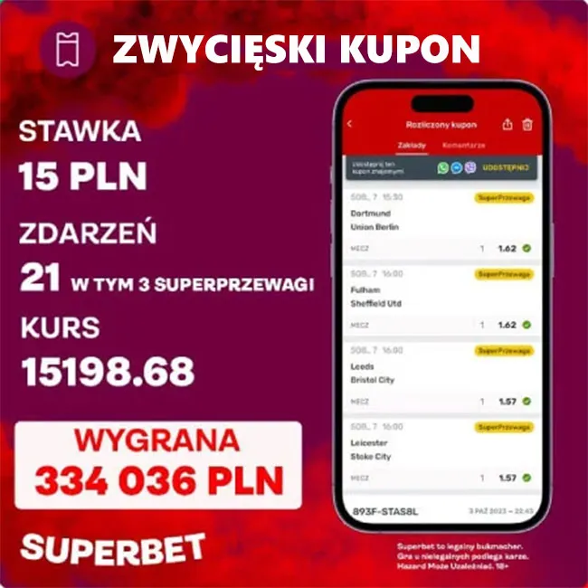 Takie kupony zdarzają się rzadko, ale właśnie one pokazują, jak duża wygrana może powstać z niewielkiej stawki wspomaganej bonusem startowym Superbet.