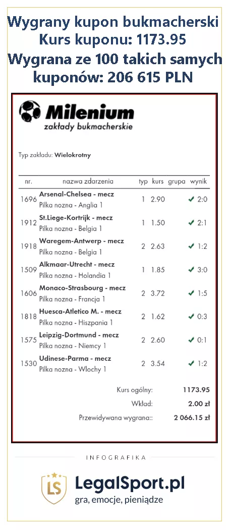 Kurs całkowity całego zakładu był ogromny – 1173.95. Z jednego zagranego za dwa złote kuponu, bohater naszego tekstu wygrał 2 066.15 złotych! Łączna wygrana ze stu jednakowych kuponów wyniosła... 206 615 złotych! Obstawiający uniknął dodatkowego 10% podatku, ponieważ jego wygrana bukmacherska z jednego kuponu nie przekroczyła 2 280 zł. Jesteście ciekawi jak typował szczęśliwy zwycięzca.