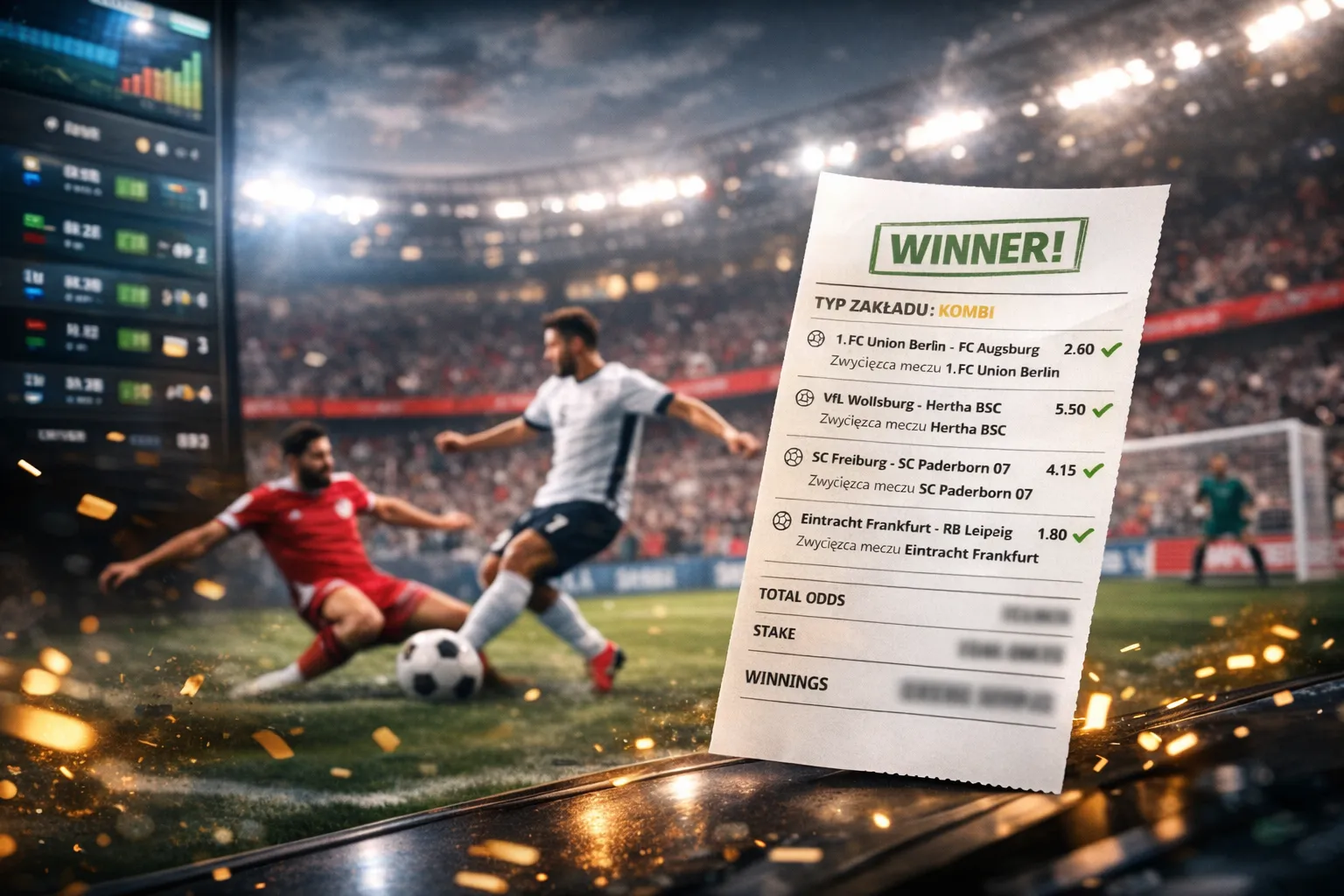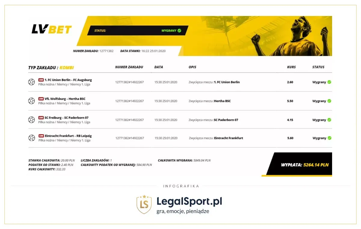 Gracz zawarł zakład LIVE kombinacyjny (tzw. KOMBI), składający się z czterech meczów niemieckiej ekstraklasy, po dwie wygrane gospodarzy i gości. Najwyższe współczynniki kursowe na kuponie wynosiły ponad 5 – zwycięstwo Eintrachtu Frankfurt nad RB Lipsk (kurs 5.60) oraz wygrana Herthy Berlin na boisku wyżej notowanego Wolfsburga (5.50). Kurs 4.15 na triumf będącego w strefie spadkowej S.C. Paderborn również był znaczny, bo taki wynik był trudny do przewidzenia. Nie korzystał z promocji, natomiast ten kupon mógł postawić za kasę z premii 2215 zł jaką za wpisanie kodu promocyjnego proponuje LVBET.