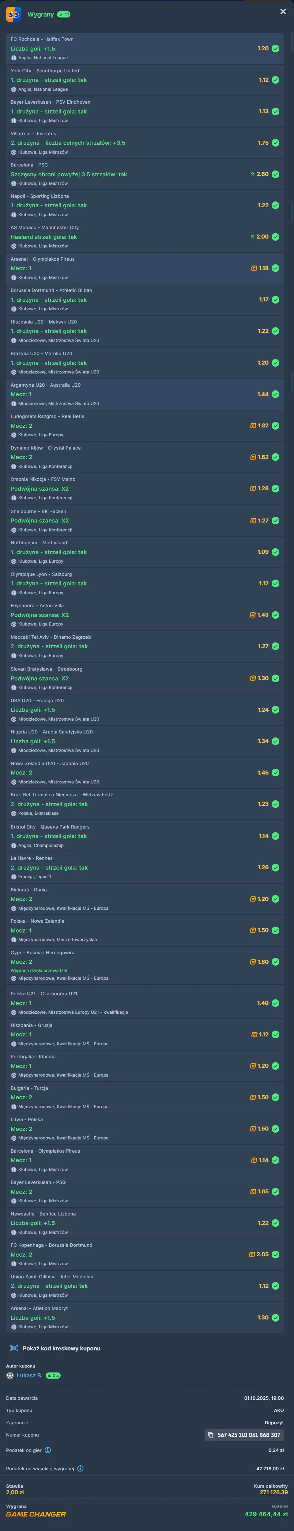 Kupon, który przyniósł wygraną w wysokości 429 464 zł, stanowił przykład tzw. taśmy, czyli zestawu wielu zdarzeń w ramach jednego zakładu. Gracz postawił zaledwie 2 zł, co przy łącznym kursie 271 126,29 przełożyło się na ogromny mnożnik wygranej. Wymagało to trafienia wszystkich 41 typowań, co świadczy o wysokim stopniu ryzyka, ale i doskonałej analizie wydarzeń sportowych przez gracza.