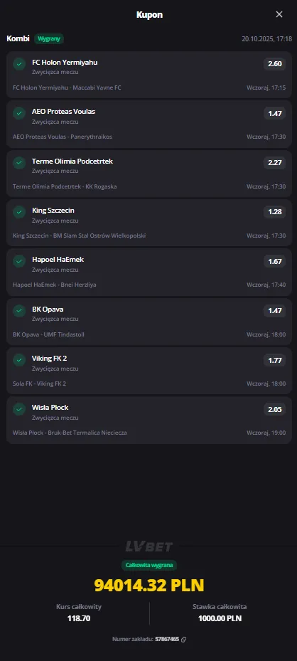 Zakład akumulowany, popularnie nazywany „AKO”, przyniósł klientowi LVBET wygraną w wysokości 94 014,32 złotych. Podstawą do tego osiągnięcia była relatywnie wysoka stawka 1000 złotych, która została pomnożona dzięki trafieniu wszystkich ośmiu zdarzeń na kuponie.