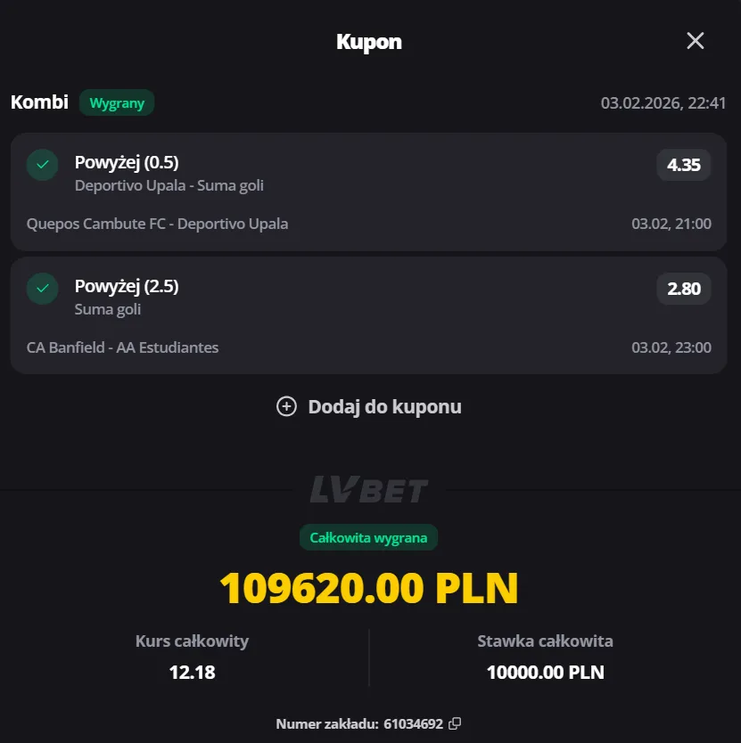 Wysoka stawka 10 000 zł sugeruje, że kupon nie był eksperymentem, lecz efektem przekonania o dodatniej wartości oczekiwanej obu zdarzeń. To przykład świadomej gry na analizie selekcji (nie wiemy czy robił to sam czy zakład był z AI), a nie na ilości typów. Gracz mógł tez korzystać z kodu do LVBET, który podnosi pakiet finansowy dla nowych klientów nawet do 2215 zł.